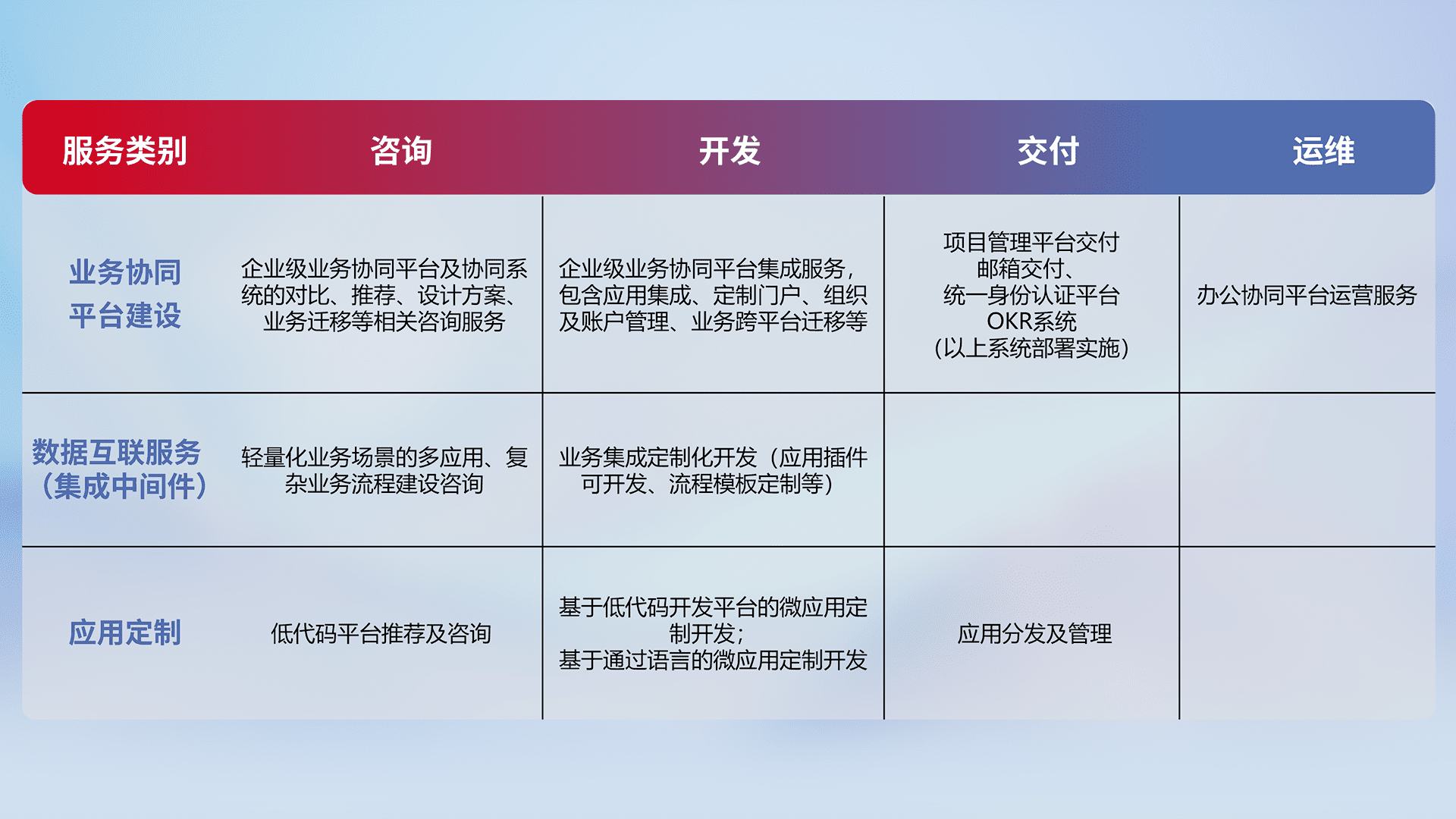 针对钉钉、、、、企微、、、、IDaas等平台级产品提供产品的规划、、方案、、、、交付、、、定制化开发等服务,,,,实现如统一协同办公、、、、智能客户服务、、混合会议管理、、、智能数据查询、、等业务场景,,,实现数字化转型。。。
